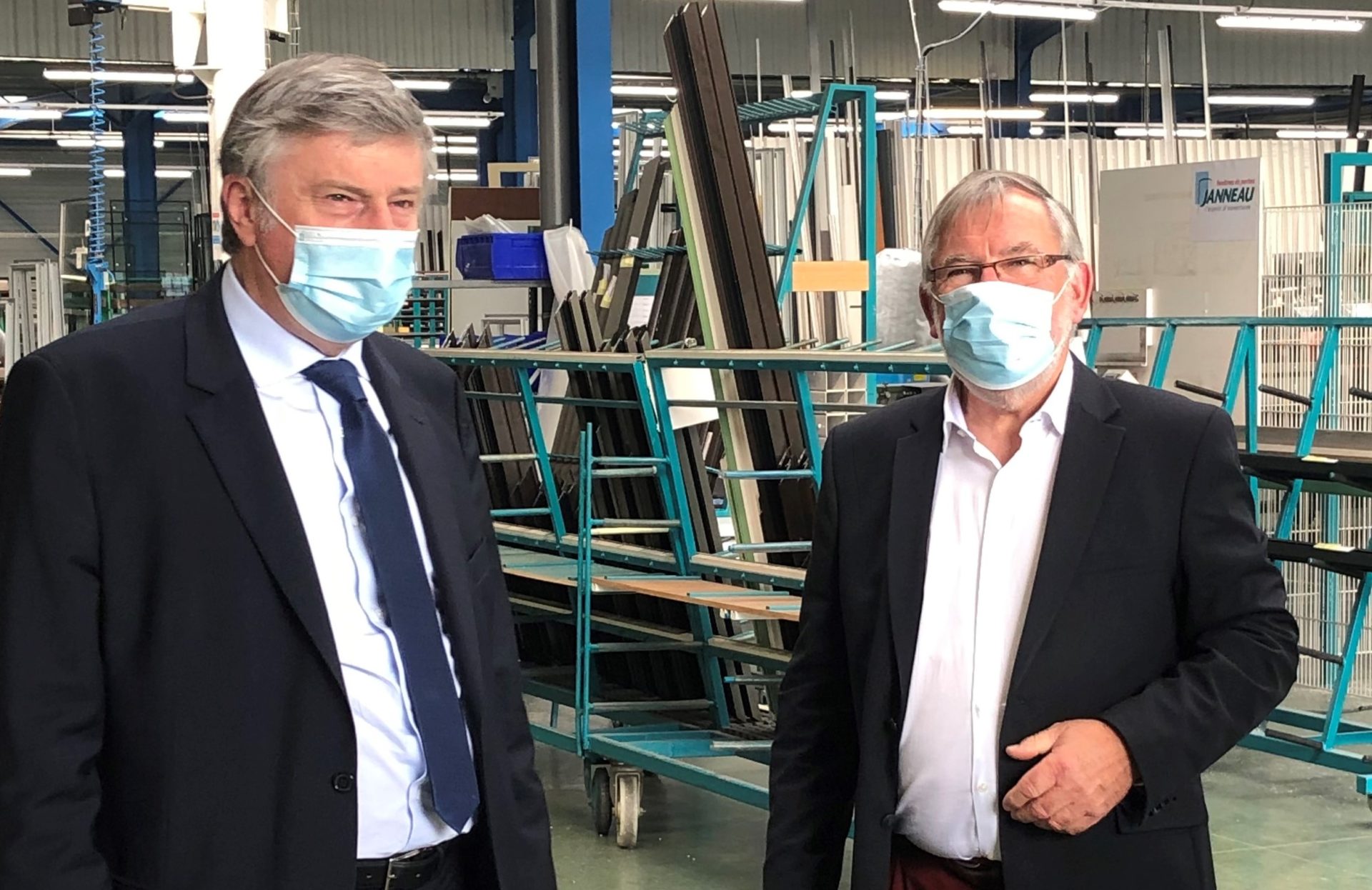 Mercredi 22 avril, le Préfet des Pays de la Loire et de la Loire-Atlantique Monsieur Claude d’Harcourt (à gauche de la photo ci-dessus) accompagné de Monsieur Louis Mazari, Directeur de l’unité départementale de la DIRECCTE ont visité le siège de Janneau Menuiseries, situé au Loroux-Bottereau (44) afin de réaffirmer le soutien et la vigilance de l’État et des Services aux Entreprises. L’entreprise Janneau Menuiseries a repris le travail le 8 avril après un arrêt forcé de 3 semaines. Pendant cette période d’arrêt, 370 des 450 collaborateurs avaient été placés en chômage partiel, et 80 en télétravail.