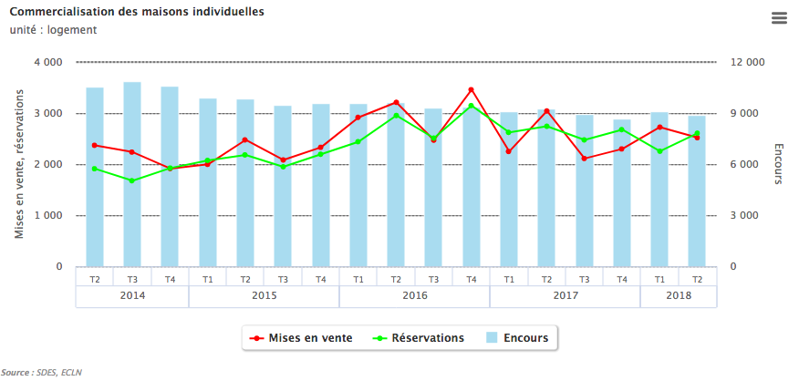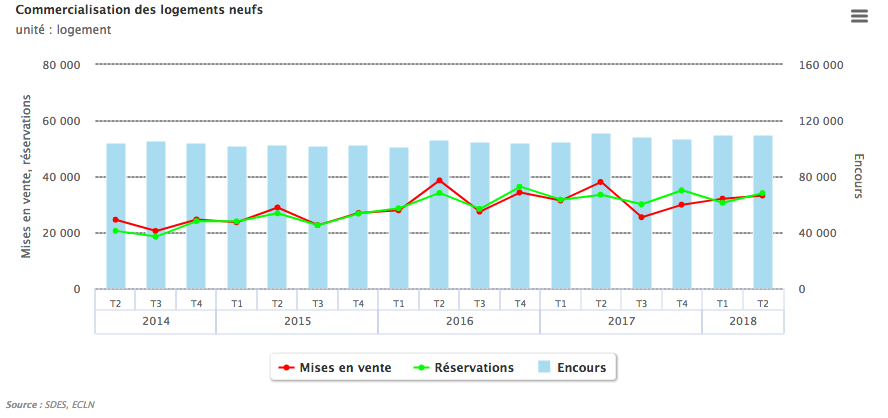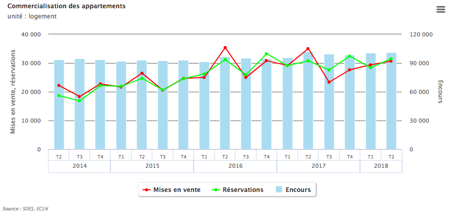 Parallèlement, les mises en vente du deuxième trimestre 2018 diminuent fortement (- 12,8 %) par rapport au deuxième trimestre 2017. On dénombre ainsi 33 200 unités mises en vente. Cependant, le nombre de logements mis en vente est en constante augmentation depuis le quatrième trimestre 2017.