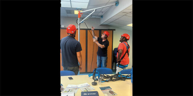 Ce matériel mobile se transporte dans un sac a dos et se déploie sur le lieu d’intervention a l’intérieur, en moins de deux minutes, en prenant appui au sol et de part et d’autre de l’ouverture contre les murs, le plafond servant uniquement a stabiliser le système avant son utilisation. Homologué pour deux personnes, il permet ainsi a un ou deux opérateurs de travailler sans prendre aucun risque. Il est destine a tous les corps d’état du bâtiment.