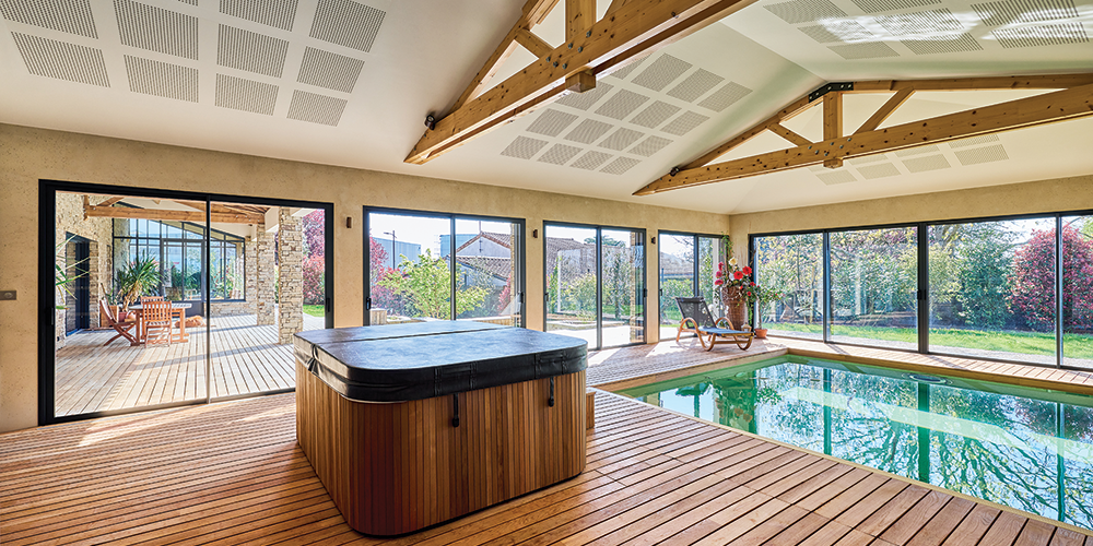 Charme, authenticité et épure contemporaine ont guidé les choix de la maîtresse des lieux. Le La est donné dès l’entrée avec l’impressionnante porte Arcachon en lames de chêne et double vantaux avec fixe en dormant de chaque côté. Très vite, place est faite à la lumière naturelle avec des menuiseries qui s’effacent devant le jardin. Ainsi, en écho à la finesse des fenêtres aluminium à ouvrant discret, pas moins de 10 baies aluminium coulissantes se déclinent sous de multiples configurations pour offrir de larges baies vitrées, une vue panoramique dégagée, une isolation thermique et phonique performante, et une grande facilité de manœuvre.